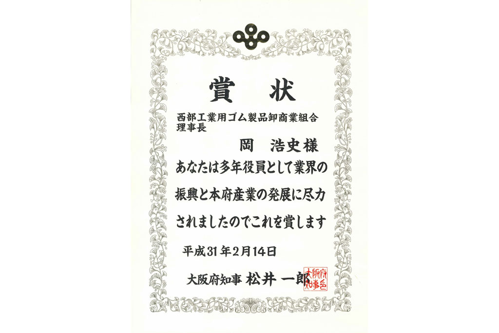 弊社代表取締役社長 岡浩史が平成30年度大阪府商工関係者表彰を受賞致しました。