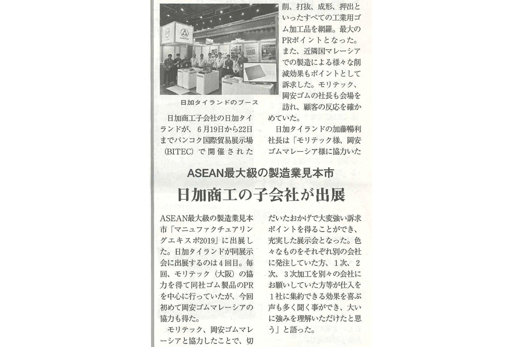 2019.8.22 お知らせ ゴム報知新聞に掲載されました。 2019年6月19日(水)~22日(土)にバンコクで開催された「Manufacturing Expo2019」への出展の様子が掲載されました。多くの皆様にご来場いただきまして、ありがとうございました。 >> WEB記事へ