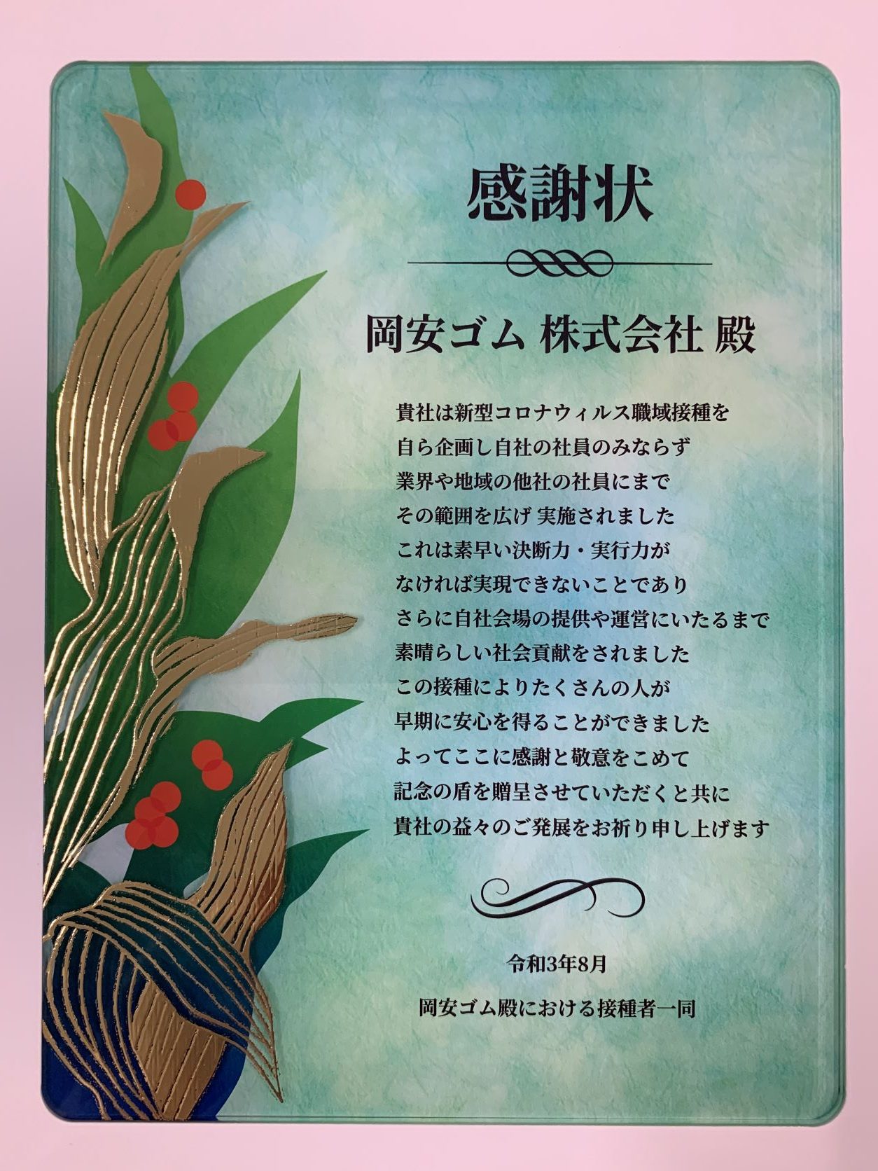 この度、職域接種頂いた皆様より感謝状を頂きました。