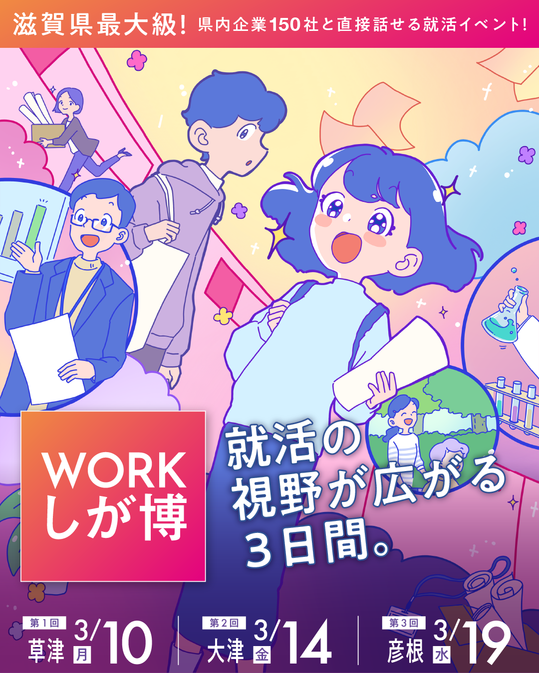 WORKしが博とは、滋賀県内の企業情報、選考情報に出会える就活イベントとなります。 弊社は、第2回 3月14日(金)の大津会場・ウカルちゃんアリーナに出展いたします。